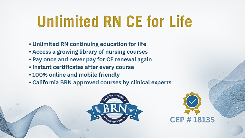 Never pay for CE again. Get unlimited RN continuing education for life with a one-time payment. Complete all future California BRN renewal requirements online anytime with self-paced courses, instant certificates, and automatic renewal reminders.