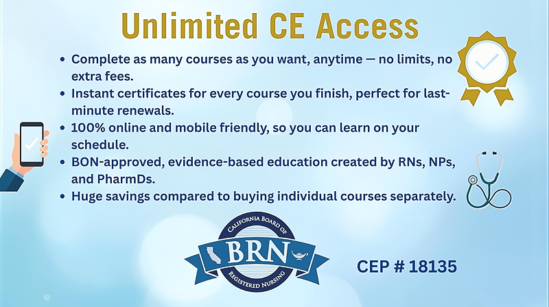 Get unlimited access to all Med Elite CE courses—fully online, self-paced, and California BON-approved. Complete any course anytime and earn instant certificates. The easiest, most flexible way for nurses to stay compliant and advance their skills.