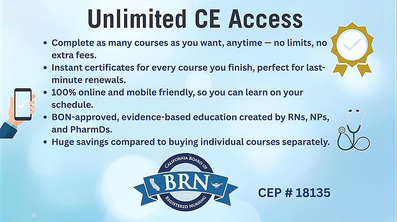 Unlimited RN CE all year long. Access every Med Elite CE course anytime with self-paced learning, instant certificates, and California BRN-approved content.