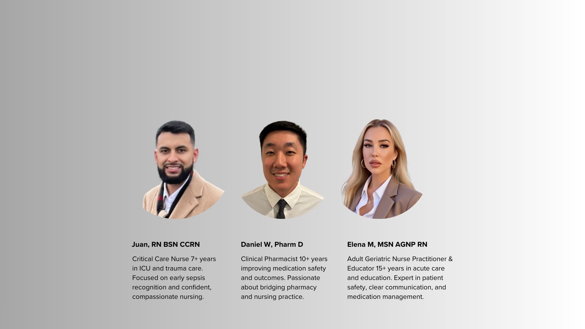 Elena M., AGNP, MSN Adult Geriatric Nurse Practitioner & Educator 15+ years in acute care and education. Expert in patient safety, clear communication, and medication management. Daniel W., PharmD Clinical Pharmacist With 10+ years of experience improving medication safety and outcomes across inpatient and outpatient settings. Committed to strengthening collaboration between pharmacy and nursing practice. Juan M., BSN, RN, CCRN Critical Care Nurse 7+ years in ICU and trauma care. Focused on early sepsis recognition and confident, compassionate nursing. Together, They Bring You: Real world clinical insight, evidence-based teaching, and a shared commitment to advancing nursing excellence across California.