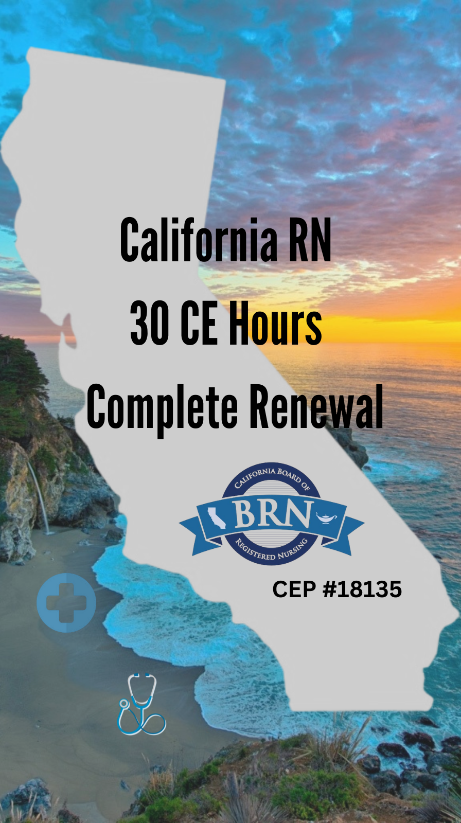 Fully approved by the California Board of Nursing for 30 Contact Hours. Meets all renewal requirements with interactive, high-impact modules. CA-BRN CEP #18135